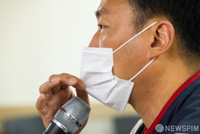 [서울=뉴스핌] 윤창빈 기자 = 민주노총 양경수 위원장 18일 오전 서울 중구 민주노총 회의실에서 출입기자 간담회를 열고 발언을 하고 있다.서울중앙지방법원은 양경수 위원장에 대해 지난 7월 3일 7·3 노동자대회를 주도한 혐의로 구속영장을 발부 했다. 2021.08.18 pangbin@newspim.com