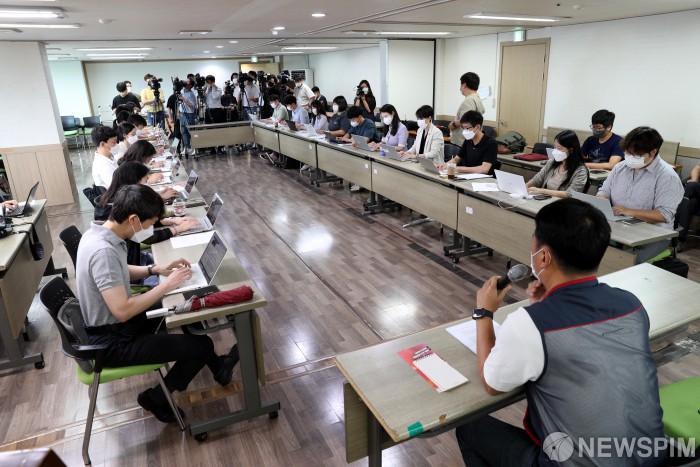 [서울=뉴스핌] 윤창빈 기자 = 민주노총 양경수 위원장 18일 오전 서울 중구 민주노총 회의실에서 출입기자 간담회를 열고 발언을 하고 있다.서울중앙지방법원은 양경수 위원장에 대해 지난 7월 3일 7·3 노동자대회를 주도한 혐의로 구속영장을 발부 했다. 2021.08.18 pangbin@newspim.com