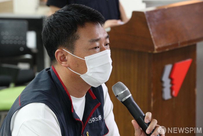 [서울=뉴스핌] 윤창빈 기자 = 민주노총 양경수 위원장 18일 오전 서울 중구 민주노총 회의실에서 출입기자 간담회를 열고 발언을 하고 있다.서울중앙지방법원은 양경수 위원장에 대해 지난 7월 3일 7·3 노동자대회를 주도한 혐의로 구속영장을 발부 했다. 2021.08.18 pangbin@newspim.com