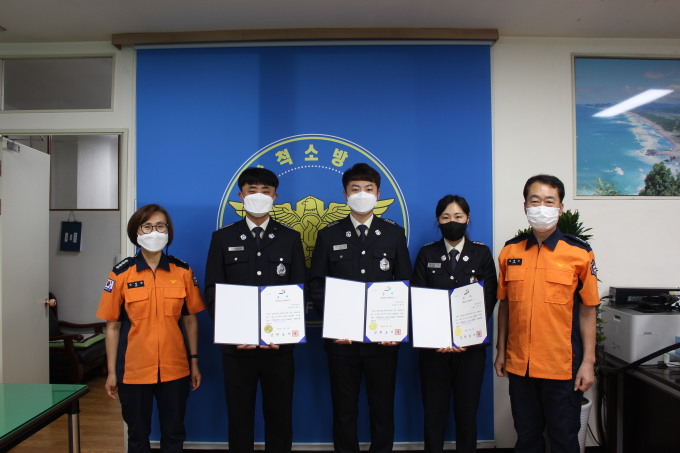 삼척소방서에 따르면 이날 브레인세이버 인증서와 배지를 수여받은 함형보 소방장, 안원모 소방교, 김예진 구급대원 등은 지난 2월 15일 오후 3시쯤 삼척시 당저동 구급출동과 같은 달 24일 오후 10시쯤 발생한 구급출동에서 환자에게 신속하게 응급처치 및 이송을 시행하여 2명의 환자를 살렸다.