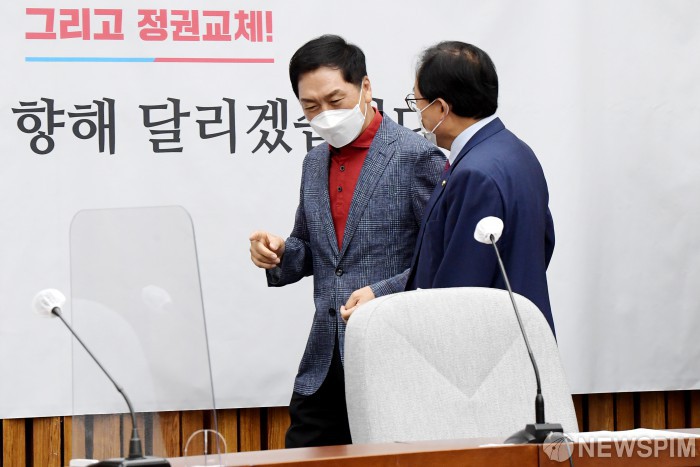 [서울=뉴스핌] 이형석 기자 = 김기현 국민의힘 원내대표가 20일 오전 서울 여의도 국회에서 열린 원내대책회의에 참석하며 "항의의 의미로 붉은 셔츠를 입었다"라고 말하고 있다. 2021.08.20 leehs@newspim.com