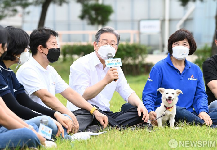 [고양=뉴스핌] 국회사진취재단 = 더불어민주당 대선 예비후보 이재명 경기도지사가 20일 경기도 고양시 덕양구 농업기술센터 내 잔디밭에서 동물복지 공약을 발표하는 기자간담회를 가졌다. 이 지사가 발언하고 있다. 2021.08.20 photo@newspim.com