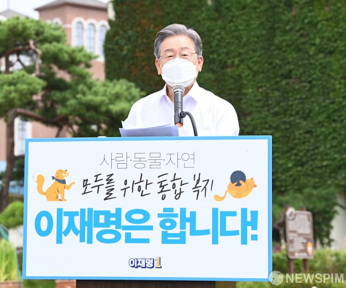 [고양=뉴스핌] 국회사진취재단 = 더불어민주당 대선 예비후보 이재명 경기도지사가 20일 경기도 고양시 덕양구 농업기술센터 내 잔디밭에서 첫 동물복지 공약을 발표하고 있다. 2021.08.20 photo@newspim.com