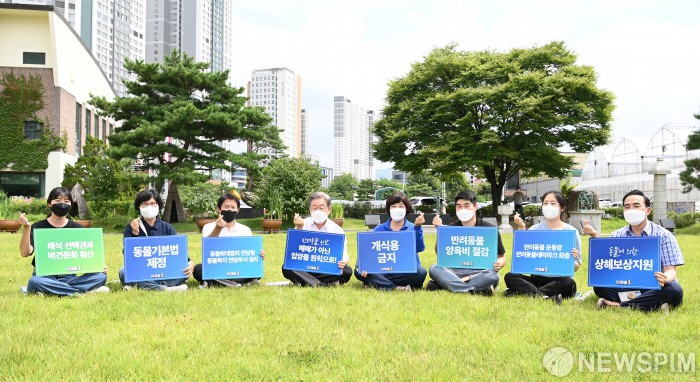 [고양=뉴스핌] 국회사진취재단 = 더불어민주당 대선 예비후보 이재명 경기도지사가 20일 경기도 고양시 덕양구 농업기술센터 내 잔디밭에서 첫 동물복지 공약을 발표하고 관계자들과 피켓을 들고 기념 촬영을 하고 있다. 2021.08.20 photo@newspim.com