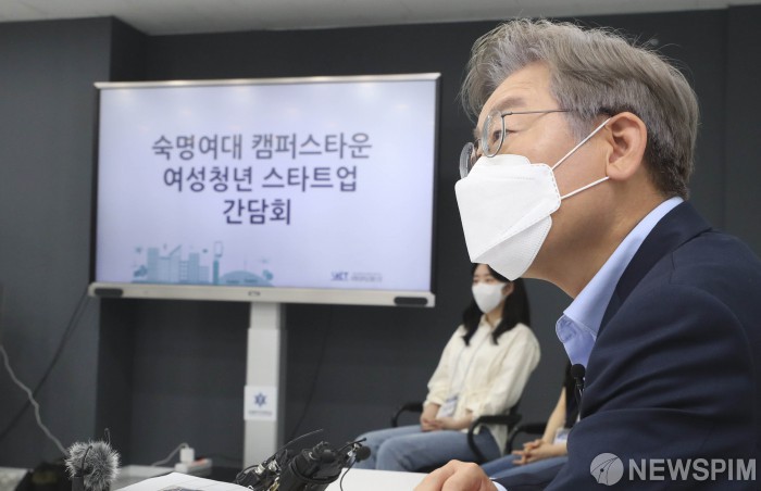[서울=뉴스핌] 국회사진취재단 = 더불어민주당 대권주자인 이재명 경기도지사 22일 서울 용산 전자랜드에 위치한 숙명여자대학교 캠퍼스타운사업단을 방문해 숙명여대 캠퍼스타운 여성청년 스타트업 간담회에 앞서 사업단에 대한 설명을 듣고 있다. 2021.08.22 photo@newspim.com