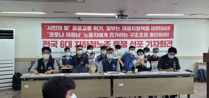 | [서울=뉴스핌] 지혜진 기자=민주노총 공공운수노조 전국철도지하철노조협의회 관계자들이 23일 '전국 5개 지하철 노조 총투쟁 선포 기자회견'을 열고 있다. 2021.08.23 heyjin6700@newspim.com |