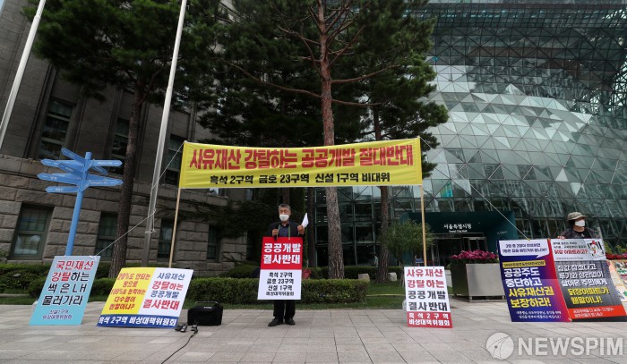 [서울=뉴스핌] 정일구 기자 = 최조홍 흑석2구역 비대위 부위원장이 23일 오전 서울 중구 서울시청 앞에서 흑석2구역·금호23구역·신설1구역 공공개발 반대 기자회견을 하고 있다. 2021.08.23 mironj19@newspim.com