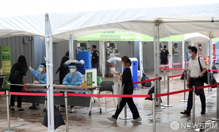 [서울=뉴스핌] 정일구 기자 = 신종 코로나바이러스 감염증(코로나19) 신규 확진자가 엿새 만에 1500명 아래로 떨어진 1418명을 기록한 23일 오후 서울 중구 서울광장에 마련된 임시 선별검사소에서 시민들이 검사를 받기 위해 줄지어 서있다. 2021.08.23 mironj19@newspim.com