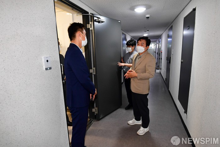 [서울=뉴스핌] 국회사진취재단 = 국민의힘 원희룡 대선 예비후보가 24일 서울 마포구 서강로의 이랜드 청년주택을 방문해 주거 공간을 살펴보고 있다. 2021.08.24 photo@newspim.com
