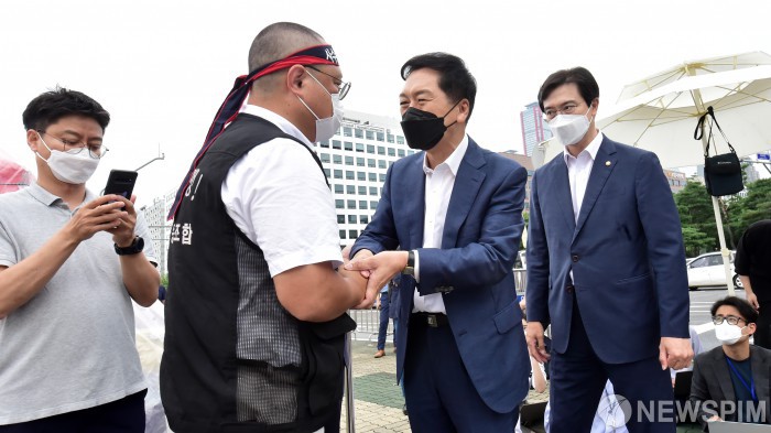 [서울=뉴스핌] 최상수 기자 = 김기현 국민의힘 원내대표가 25일 서울 여의도 국회 정문 앞에서 열린 언론독재법과 반민주 악법 끝장투쟁 범국민 필리버스터 현장에 참석, 허성권 KBS노조위원장과 인사를 나누고 있다. 2021.08.25 kilroy023@newspim.com