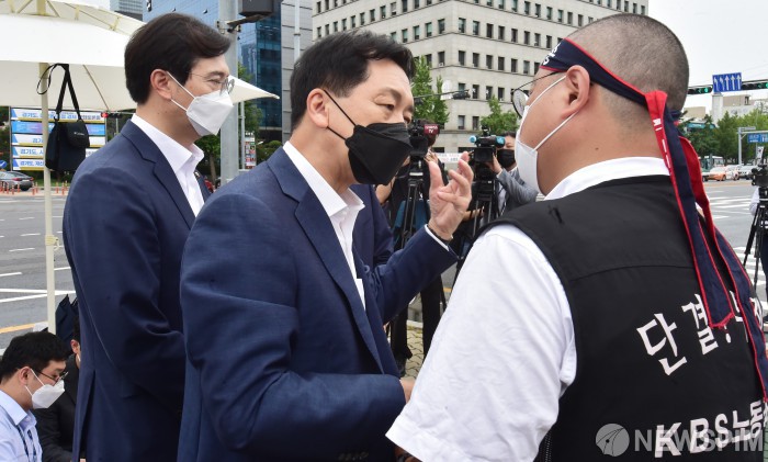 [서울=뉴스핌] 최상수 기자 = 김기현 국민의힘 원내대표가 25일 서울 여의도 국회 정문 앞에서 열린 언론독재법과 반민주 악법 끝장투쟁 범국민 필리버스터 현장에 참석, 허성권 KBS노조위원장과 인사를 나누고 있다. 2021.08.25 kilroy023@newspim.com