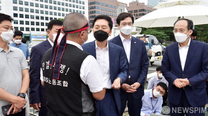 [서울=뉴스핌] 최상수 기자 = 김기현 국민의힘 원내대표가 25일 서울 여의도 국회 정문 앞에서 열린 언론독재법과 반민주 악법 끝장투쟁 범국민 필리버스터 현장에 참석, 허성권 KBS노조위원장과 대화를 나누고 있다. 2021.08.25 kilroy023@newspim.com