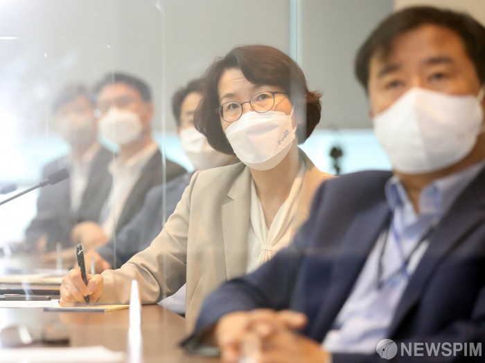 [서울=뉴스핌]임혜숙 과학기술정보통신부 장관이 26일 오전 대전광역시 유성구 LIG넥스원 대전하우스에서 열린 'KPS 개발전략 보고회' 에 참석해 발표를 듣고 있다.[사진=과학기술정보통신부] 2021.08.26 photo@newspim.com
