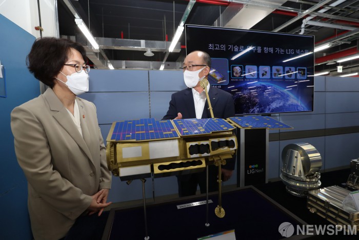 [서울=뉴스핌]임혜숙 과학기술정보통신부 장관이 26일 오전 대전광역시 유성구 LIG넥스원 대전하우스를 방문해 김지찬 LIG넥스원 대표로부터 '다목적실용위성' 에 대한 설명을 듣고 있다.[사진=과학기술정보통신부] 2021.08.26 photo@newspim.com