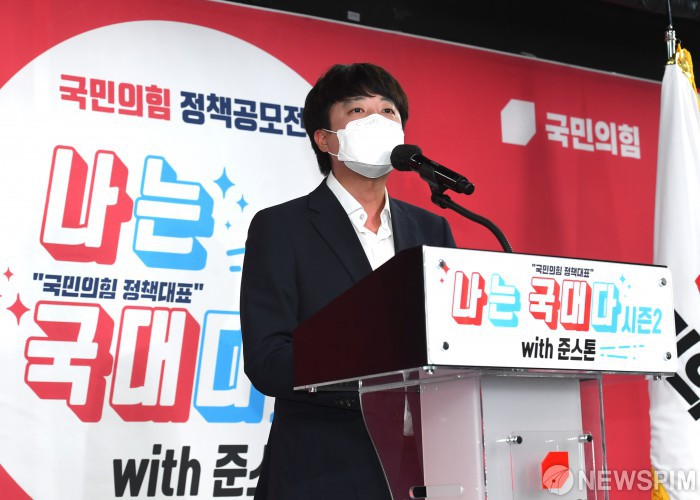 [서울=뉴스핌] 최상수 기자 = 이준석 국민의힘 대표가 27일 오후 서울 영등포구 여의도 중앙당사에서 열린 '국민의힘 나는 국대다 시즌2 with 준스톤' 결선심사에서 인사말을 하고 있다. 2021.08.27 kilroy023@newspim.com