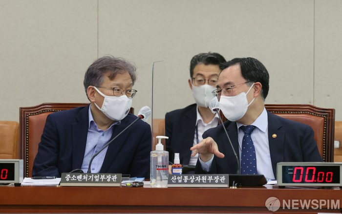 [서울=뉴스핌] 이형석 기자 = 권칠승 중소벤처기업부 장관과 문승욱 산업통상자원부 장관이 30일 오후 국회에서 열린 산업통상자원중소벤처기업위원회에서 이야기를 나누고 있다. 2021.08.30 leehs@newspim.com