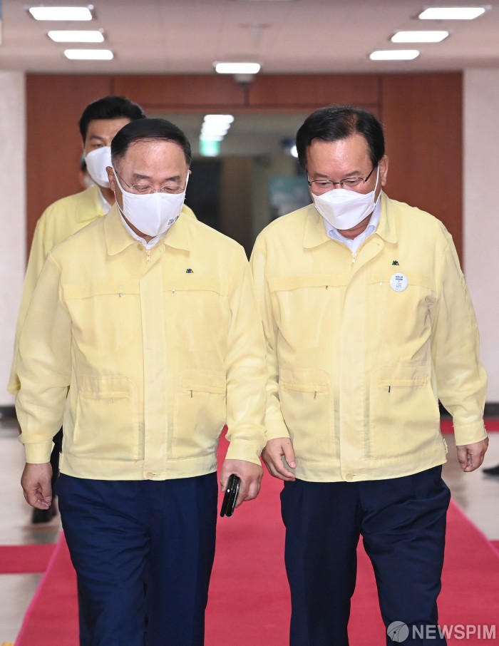 [서울=뉴스핌] 김학선 기자 = 김부겸 국무총리와 홍남기 경제부총리 겸 기획재정부 장관이 31일 서울 종로구 정부서울청사에서 열린 국무회의에 참석하고 있다. 2021.08.31 yooksa@newspim.com