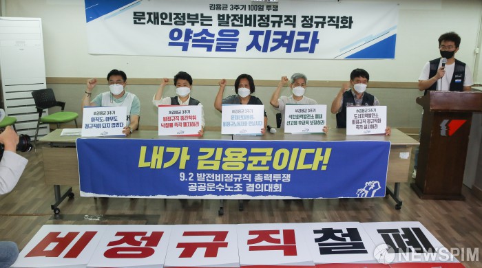 [서울=뉴스핌] 최상수 기자 = 31일 오전 서울 중구 전국민주노동조합총연맹에서 고(故) 김용균 3주기 100일 투쟁 돌입 기자회견 '문재인정부는 발전 비정규직 정규직 전환 약속을 지켜라'가 열리고 있다. 2021.08.31 kilroy023@newspim.com