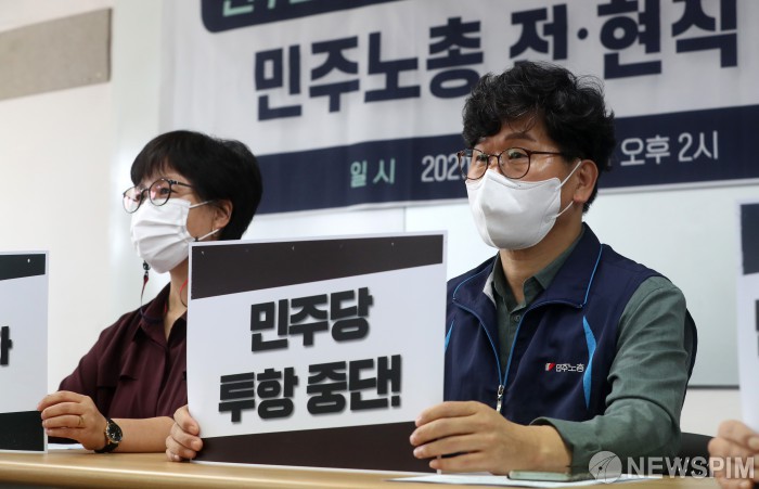[서울=뉴스핌] 정일구 기자 = 한상균 전 민주노총 위원장(오른쪽)과 전·현직 대표자들이 1일 오후 서울 중구 민주노총에서 열린 민주노총 일부 간부들의 보수정당 대선후보 캠프행에 대한 기자회견에서 손팻말을 들고 있다. 2021.09.01 mironj19@newspim.com