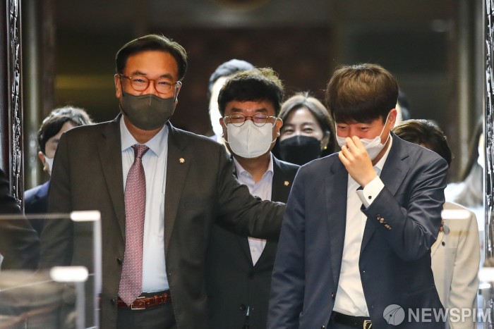 [서울=뉴스핌] 이형석 기자 = 이준석 국민의힘 대표(오른쪽)와 정진석 국회부의장(왼쪽)이 2일 오전 국회에서 열린 정기국회 대비 의원워크숍에 참석하고 있다. 2021.09.02 leehs@newspim.com