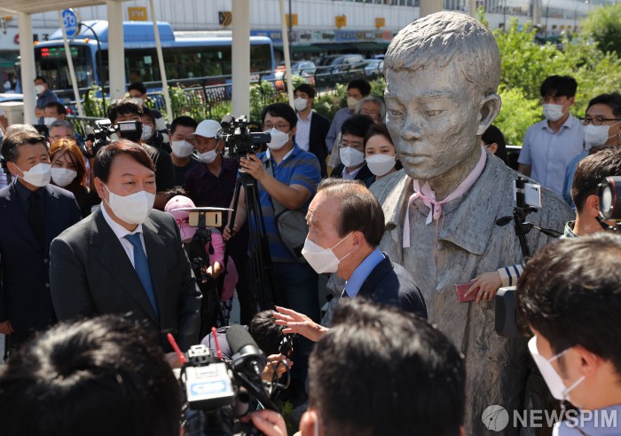 [서울=뉴스핌] 국회사진취재단 = 국민의힘 대선 경선후보 윤석열 전 검찰총장과 장기표 후보가 3일 서울 종로구 청계천 버들다리(전태일다리)에서 전태일 열사의 어머니 이소선 여사 10주기를 맞아 전태일 열사 동상에 참배한 뒤 대화하고 있다. 2021.09.03 photo@newspim.com