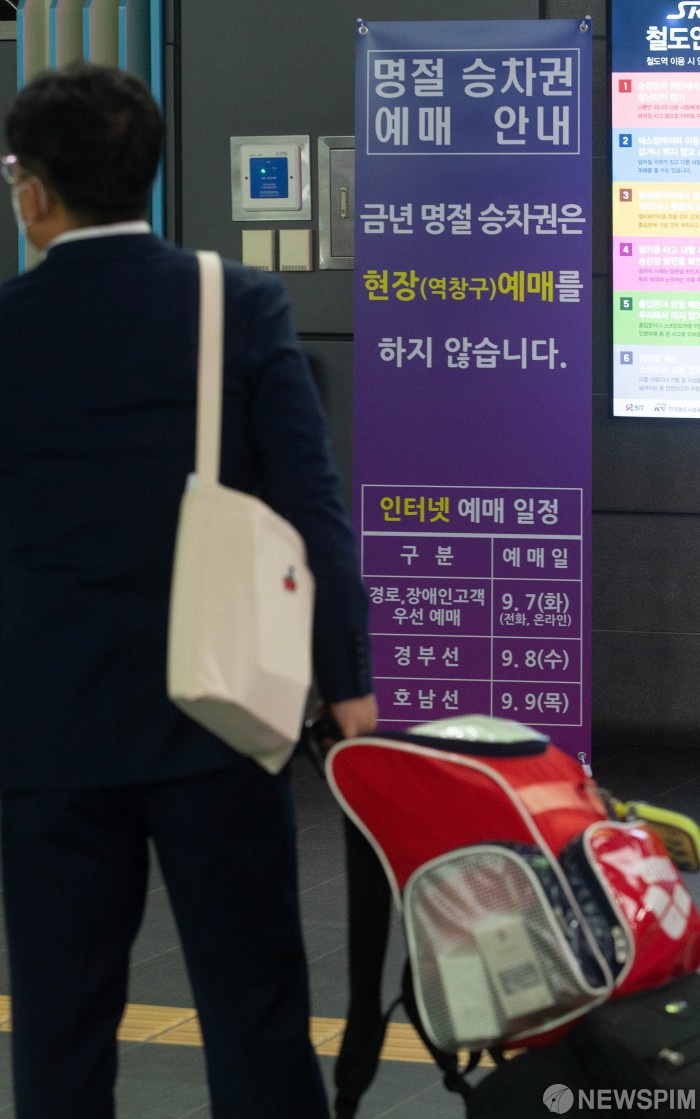 [서울=뉴스핌] 윤창빈 기자 = 7일 오전 서울 강남구 SRT 수서역에 추석명절 SRT승차권 비대면 예매 안내문이 붙어있다. 수서고속철도SRT 운영사인 SR은 오늘부터 모레까지 오는 17~22일 추석 연휴 6일간 운행하는 모든 SRT 열차의 승차권 예매를 온라인과 전화 접수 등 100% 비대면으로 진행한다. 2021.09.07 pangbin@newspim.com