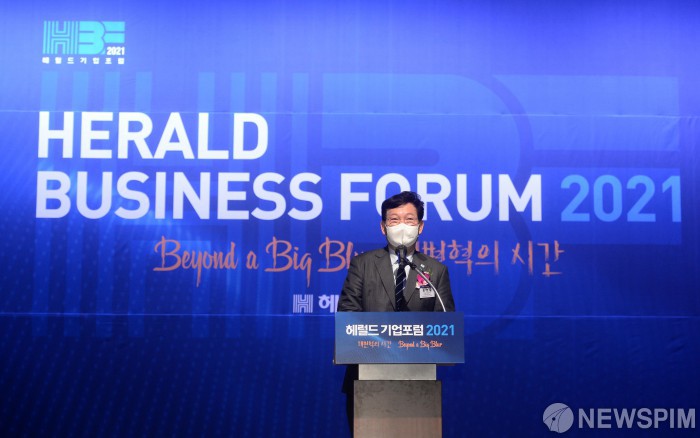 [서울=뉴스핌] 8일 오전 서울 중구 대한상공회의소 국제회의장에서 열린 헤럴드기업포럼2021에서 송영길 더불어민주당 대표가 축사를 하고 있다. [사진=헤럴드] 2021.09.08 photo@newspim.com