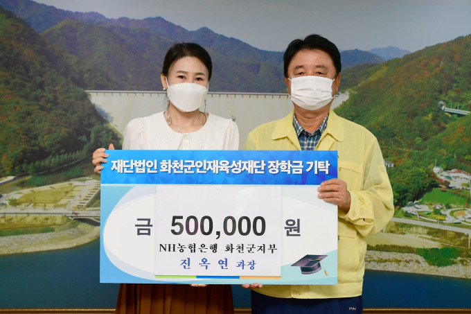 NH농협은행 화천군지부 진옥연 과장은 8일 최문순 화천군 인재육성재단 이사장을 방문해 보이스 피싱 예방 공로 포상금 등 장학금 50만원을 기탁했다.