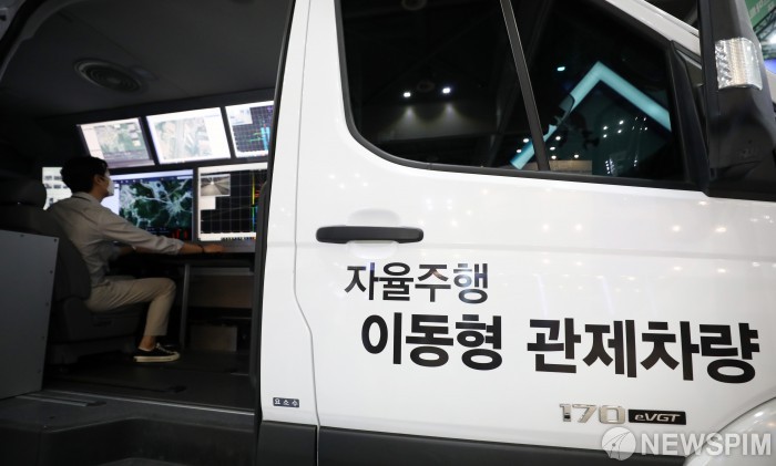 [고양=뉴스핌] 정일구 기자 = 8일 오후 경기 고양시 킨텍스 제1전시장에서 열린 '제5회 월드 스마트시티 엑스포'에서 관계자가 자율주행 이동형 관제차량을 시연하고 있다. 2021.09.08 mironj19@newspim.com