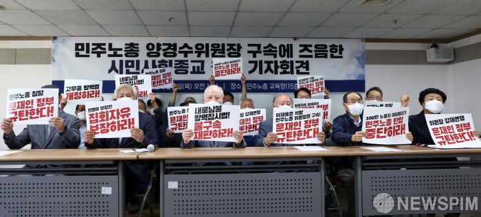 [서울=뉴스핌] 정일구 기자 = 9일 오전 서울 중구 민주노총에서 열린 민주노총 양경수 위원장 구속에 즈음한 시민사회종교 원로 기자회견에서 참석자들이 구호를 외치고 있다. 2021.09.09 mironj19@newspim.com