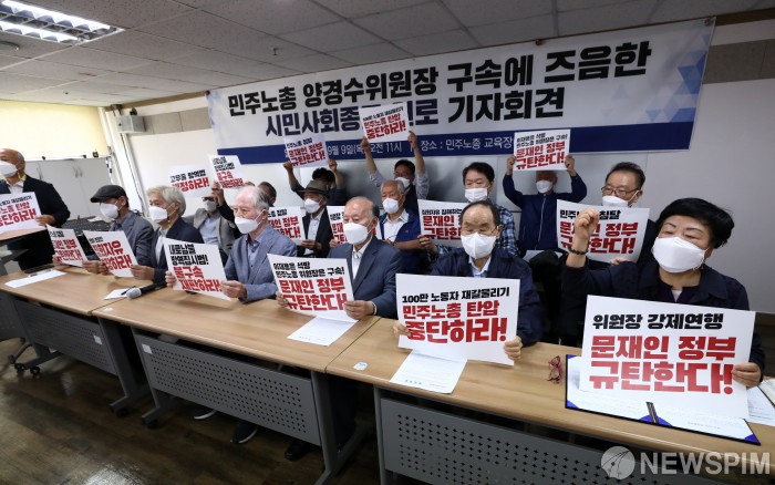 [서울=뉴스핌] 정일구 기자 = 9일 오전 서울 중구 민주노총에서 열린 민주노총 양경수 위원장 구속에 즈음한 시민사회종교 원로 기자회견에서 참석자들이 구호를 외치고 있다. 2021.09.09 mironj19@newspim.com