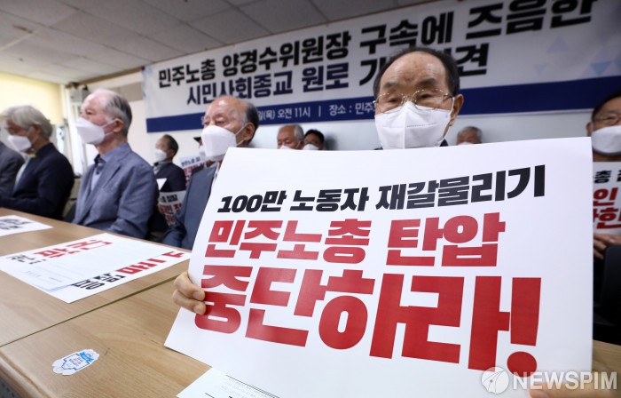 [서울=뉴스핌] 정일구 기자 = 9일 오전 서울 중구 민주노총에서 열린 민주노총 양경수 위원장 구속에 즈음한 시민사회종교 원로 기자회견에서 참석자들이 손피켓을 들고 있다. 2021.09.09 mironj19@newspim.com