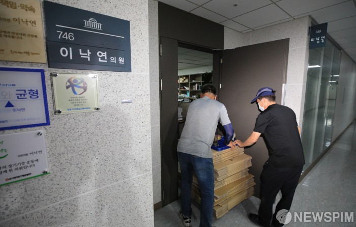 [서울=뉴스핌] 이형석 기자 = 9일 서울 여의도 국회의원회관에서 관계자들이 짐 정리를 위해 박스를 들고 이낙연 의원실로 들어서고 있다. 앞서 더불어민주당 대선 예비후보인 이낙연 의원은 전날 대선 승리를 위해 의원직을 사퇴하겠다고 밝혔다. 2021.09.09 leehs@newspim.com