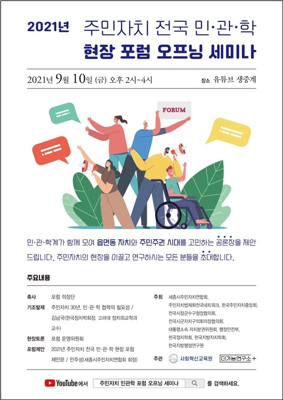 이외에도 현장 포럼은 전국 단위 주민자치 학습모임, 주민자치 관련 공무원과 전문가 교육을 지원해 주민자치에 대한 사회적 관심을 높일 예정이다. 이번 출범식과 오프닝 세미나는 코로나19 상황을 고려해 온라인으로 열린다.