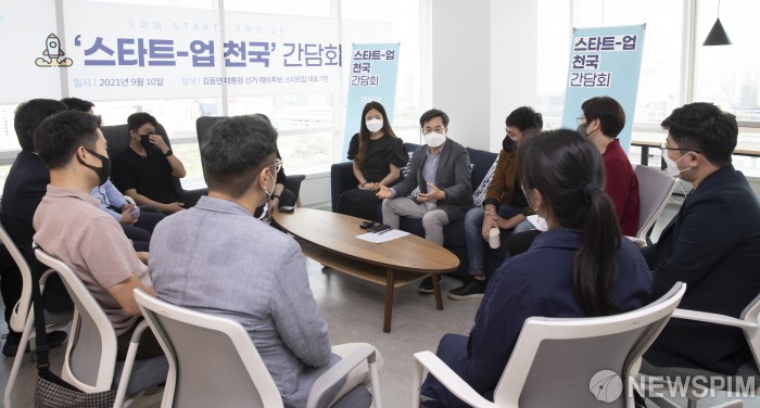 [서울=뉴스핌] 국회사진취재단 = 대선 출마를 선언한 김동연 전 경제부총리(가운데)가 10일 오후 서울 영등포구 제일빌딩에서 열린 스타트업 천국 간담회에 참석해 인사말을 하고 있다. 2021.09.10 photo@newspim.com