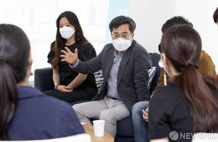 [서울=뉴스핌] 국회사진취재단 = 대선 출마를 선언한 김동연 전 경제부총리(가운데)가 10일 오후 서울 영등포구 제일빌딩에서 열린 스타트업 천국 간담회에 참석해 인사말을 하고 있다. 2021.09.10 photo@newspim.com