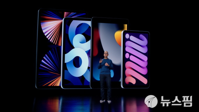 [쿠퍼티노 로이터=뉴스핌] 이영기 기자= 14일(현지시간) 팀 쿡 애플 최고경영자(CEO)가 미국 캘리포니아주 쿠퍼티노 애플파크 스티브잡스 극장에서 열린 신제품 발표에서 새로운 아이패드 라인업을 소개하고 있다. 2021.09.15 007@newspim.com