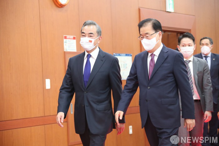 [서울=뉴스핌] 최상수 기자 = 정의용 외교부 장관(오른쪽)과 왕이(王毅) 중국 외교담당 국무위원 겸 외교부장이 15일 오전 서울 종로구 외교부 청사에서 열린 한중 외교장관회담에 참석하고 있다. 2021.09.15 kilroy023@newspim.com