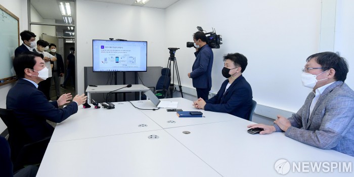 [서울=뉴스핌] 국회사진취재단 = 안철수 국민의당 대표가 15일 서울 관악구 서울대 크립토랩을 방문해 천정희 교수에게 ‘코로나동선안심이’ 애플리케이션에 관한 설명을 들은 뒤 발언하고 있다. 2021.09.15 photo@newspim.com