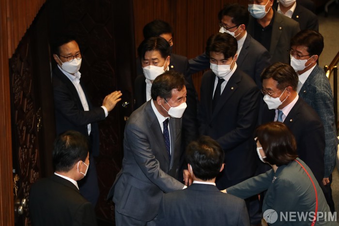 [서울=뉴스핌] 이형석 기자 = 이낙연 더불어민주당 의원이 15일 국회에서 열린 본회의에서 본인의 사직안에 대해 투표를 마친 뒤 의원들과 인사하고 있다. 2021.09.15 leehs@newspim.com