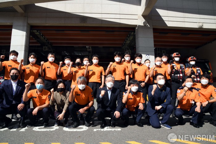 [서울=뉴스핌] 국회사진취재단 = 더불어민주당 이재명 대선 예비후보는 22일 서울 동작 소방서를 방문하여 사회 필수인력인 소방관들을 격려하고 얘로 사항을 경청한후 기념촬영을 하고 있다. 2021.09.22 photo@newspim.com