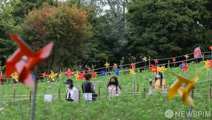 [서울=뉴스핌] 최상수 기자 = 절기상 추분이 이틀 지난 25일 오후 서울 송파구 올림픽공원 들꽃마루 코스모스 화원에 바람개비들이 놓여있다. 2021.09.25 kilroy023@newspim.com