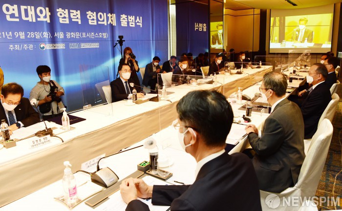 [서울=뉴스핌] 김학선 기자 = 문승욱 산업통상자원부 장관이 28일 서울 종로구 포시즌스 호텔 아라홀에서 열린 '반도체 연대와 협력 협의체 출범식'에서 인사말을 하고 있다. 2021.09.28 yooksa@newspim.com