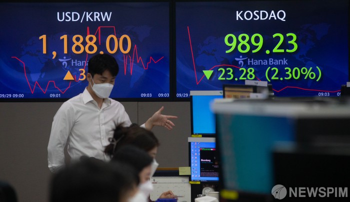 [서울=뉴스핌] 윤창빈 기자 = 29일 코스피는 42.42포인트(1.37%) 내린 3055.50로 하락 출발했다. 코스닥 지수도 17.90포인트(1.77%) 내린 994.61로 하락 출발했다. 서울외환시장에서 달러/원 환율은 3.6원 오른 1,188.0원에 개장했다. 이날 오전 서울 중구 하나은행 딜링룸에서 딜러들이 업무를 보고 있다. 2021.09.29 pangbin@newspim.com
