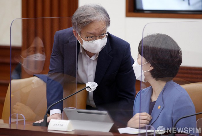 [서울=뉴스핌] 김학선 기자 = 유은혜 부총리 겸 교육부 장관(오른쪽)과 권칠승 중소벤처기업부 장관이 30일 서울 종로구 정부서울청사에서 열린 국정현안점검조정회의에서 대화하고 있다. 2021.09.30 yooksa@newspim.com