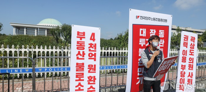 [서울=뉴스핌] 최상수 기자 = 전국민주노동조합총연맹이 30일 오전 서울 여의도 국회에서 기자회견을 열고 대장동 투기 철저수사 및 불로소득 환수를 촉구하고 있다. 2021.09.30 kilroy023@newspim.com