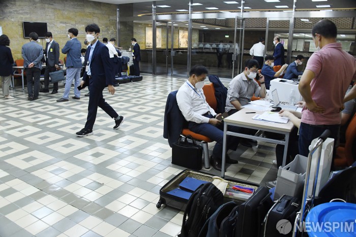 [서울=뉴스핌] 최상수 기자 = 2021년 국정감사 첫날인 1일 국회 상임위원회 회의실 앞에서 코로나로 인한 출입인원 제한으로 공무원들이 회의장 출입이 제한되어 복도에서 대기하고 있다. 2021.10.01 kilroy023@newspim.com