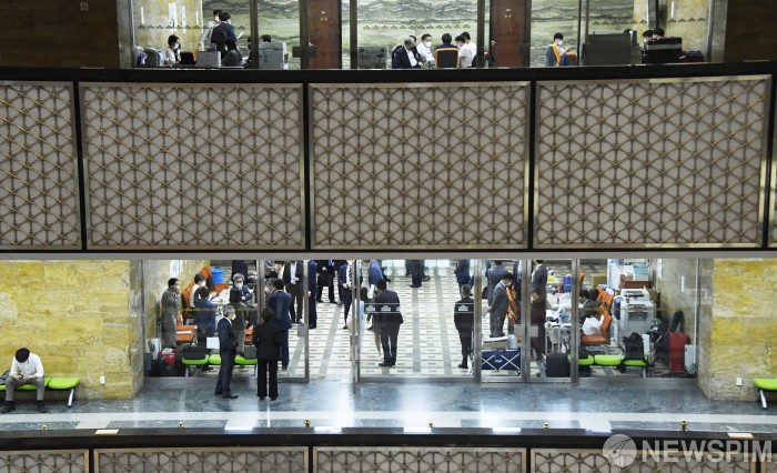[서울=뉴스핌] 최상수 기자 = 2021년 국정감사 첫날인 1일 국회 외교통일위원회 회의실 앞에서 코로나로 인한 출입인원 제한으로 공무원들이 회의장 출입이 제한되어 복도에서 대기하고 있다. 2021.10.01 kilroy023@newspim.com