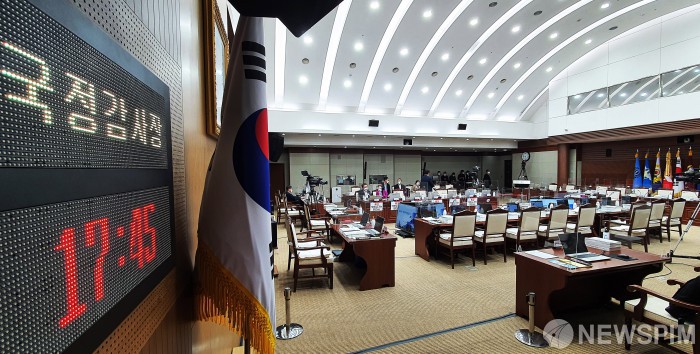 [서울=뉴스핌] 국회사진취재단 = 5일 서울 용산구 국방부에서 예정된 국회 국방위원회의 국방부 등에 대한 국정감사가 ‘특검 거부하는자가 범인이다’피켓 등으로 개회조차 하지 못한 채 오후 5시 45분을 넘기고 있다. 2021.10.05 photo@newspim.com