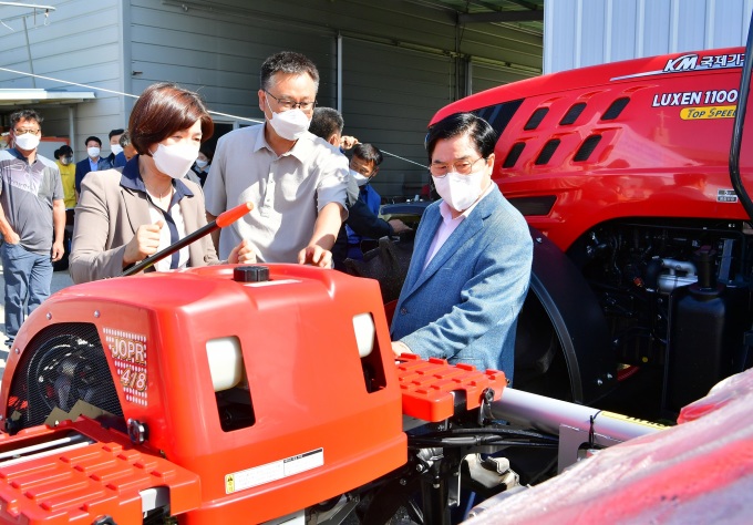 | 임대농기계를 살펴보고 있는 유두석 장성군수 [사진=장성군] 2021.10.06 kh10890@newspim.com |
